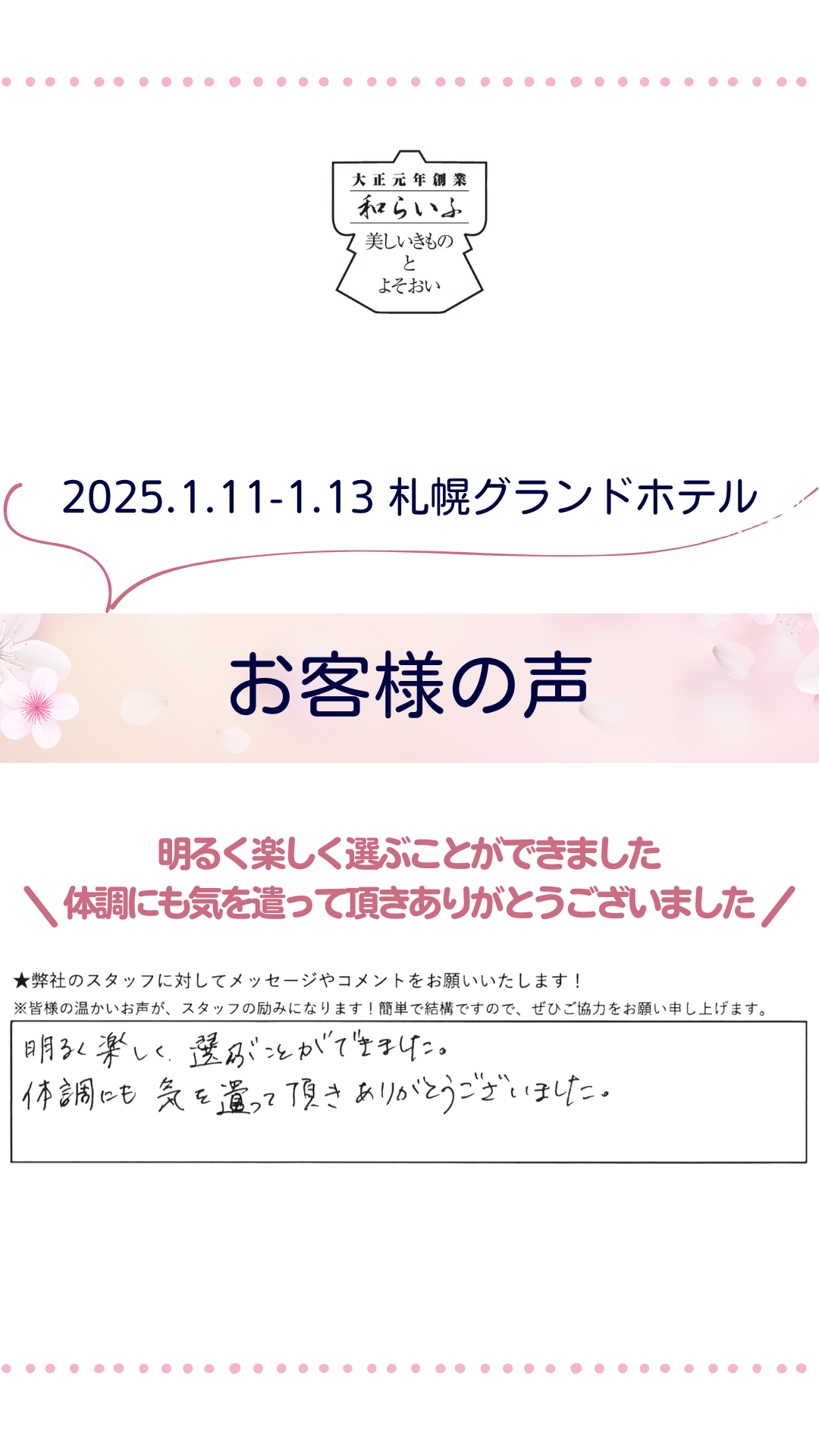 明るく楽しく選ぶことができました 体調にも気を遣って頂きありがとうございました