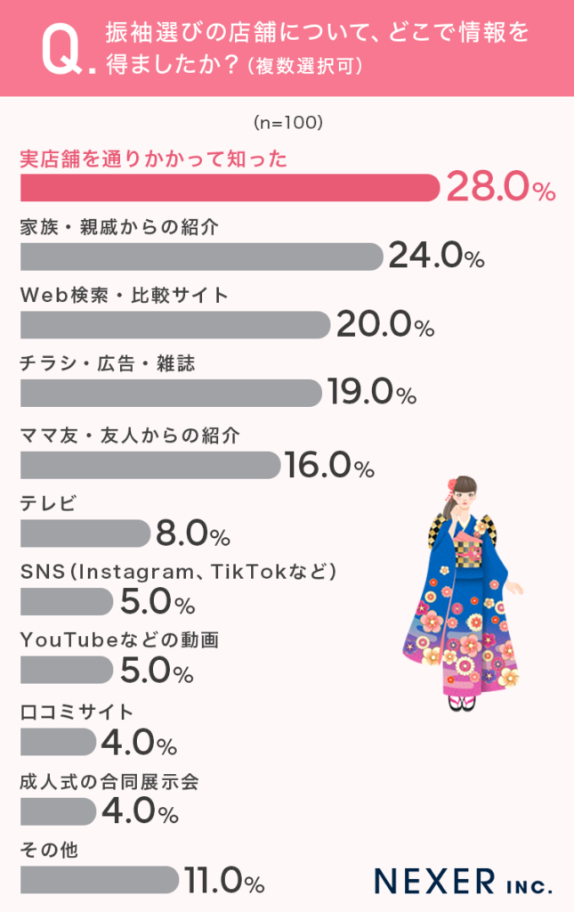 「振袖レンタルの予約時期に関するアンケート」調査概要調査手法:インターネットでのアンケート調査期間:2025年11月28日 ~ 12月3日調査対象者:振袖をレンタルしたことがあるもしくは検討したことがある女性、または子どもに振袖をレンタルした方有効回答:100サンプル質問内容:質問1:振袖を選んだのは、成人式の何年前(何か月前)でしたか?質問2:振袖レンタルを検討する際、何店舗くらい比較しましたか?質問3:その理由を教えてください。質問4:振袖選びの店舗について、どこで情報を得ましたか?質問5:最終的に選んだ店舗の決め手は何ですか?質問6:レンタル店を選ぶ際に重視したポイントを教えてください。質問7:どのようなサービスや特典があれば、振袖レンタルをより安心して利用できますか?※原則として小数点以下第2位を四捨五入し表記しているため、合計が100%にならない場合があります。 |