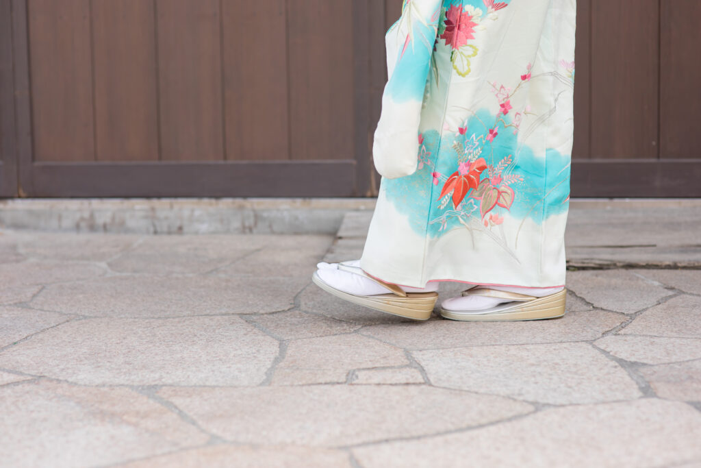 振袖を着ているときは、普段よりも歩幅を小さくし、ゆっくりとした動きを心がけることが大切です。背筋を伸ばし、つま先をやや内側に向けるように歩くと、上品で落ち着いた印象になります。草履はすり足気味に静かに運ぶようにすると、より美しく見えます。急いで大股で歩くと着崩れの原因にもなるため注意しましょう。