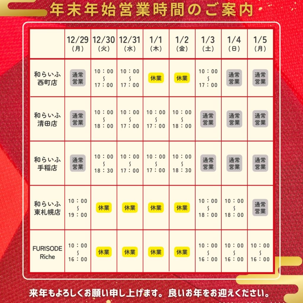 ◆FURISODE Riche →12/30(火)~1/2(金)休業、12/29(月)・1/3(土)~1/5(月)16:00までの短縮営業