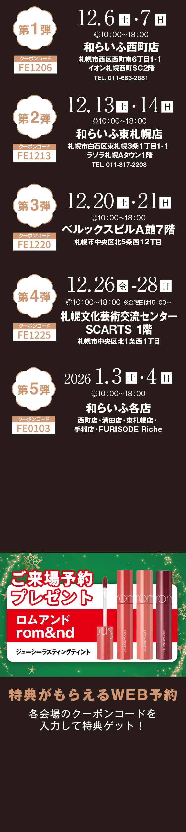 12月6日(土) 12月7日(日) 12月13日(土) 12月14日(日) 12月20日(土) 12月21日(日) 12月26日(金) 12月27日(土) 12月28日(日) 1月3日(土) 1月4日(日)